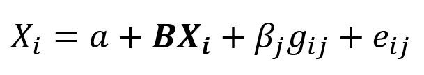 where Yi is the phenotype of participant i, Xi is a vector of covariates for participant i, gij is the numerical genotype for participant i at SNP j, and eij is the error term. B is a vector of regression coefficients for the covariates and βj is the regression coefficient for SNP j. From the fitted regression model, the beta coefficient βj for the SNP represents the average substitution effect of having one additional copy of the effect allele.