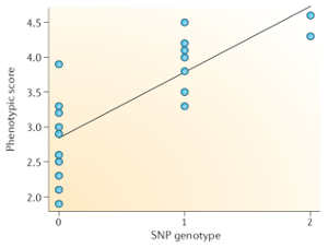 To run the regression, the SNP genotype is encoded to a number as a count of one of the alleles (which allele is chosen is arbitrary, but traditionally it is the minor allele). The chosen allele is called the “effect allele”. In this example, if the T allele is chosen as the effect allele, then the numeric encoding is the number of T alleles in the genotype: CC = 0, CT and TC = 1, and TT = 2. This numeric representation can then be entered into a regression formula: