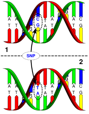 A SNP occurs when a single base of DNA is substituted with another, resulting in a polymorphism (for example, a C–G basepair being subtituted with a T-A basepair). SNPs occur once in every 100–1000 basepairs (BP) on average. Currently there are about 80 million known SNPs in the human genome.