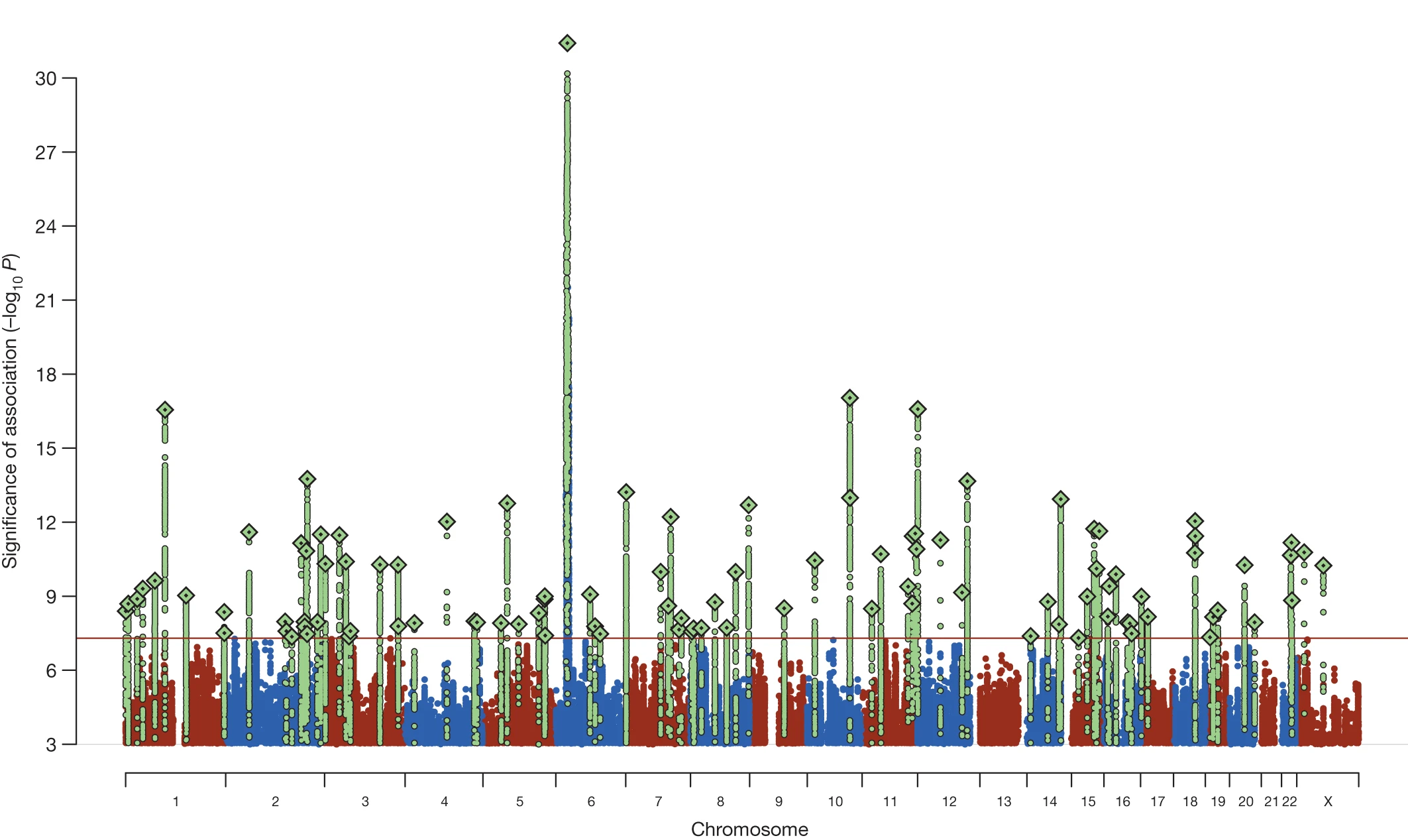The results from a genome-wide association study can be visualised using a graph that is called a Manhattan plot. The plot features results for each SNP plotted by chromosome and basepair position on the x-axis versus transformed p-values on the y-axis. The p-values are transformed as the negative log 10 [-log10(P)], which turns very small p-values into large, positive numbers.