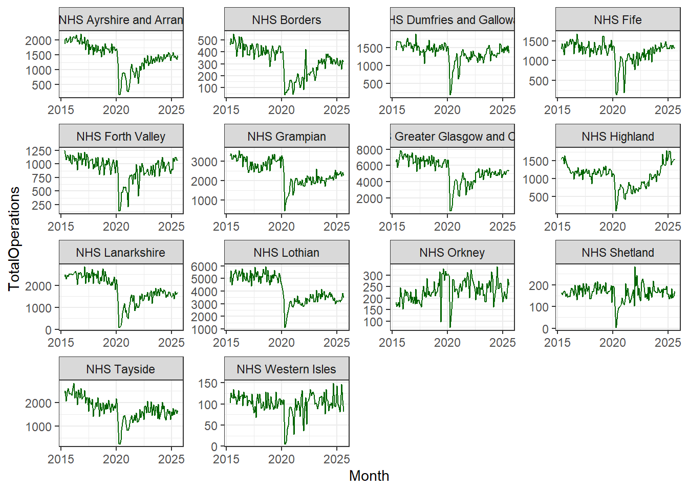 Now we can see very similar trends across all Health Boards concerning the recent drop in the total number of operations in 2020 and an increase around 2021.