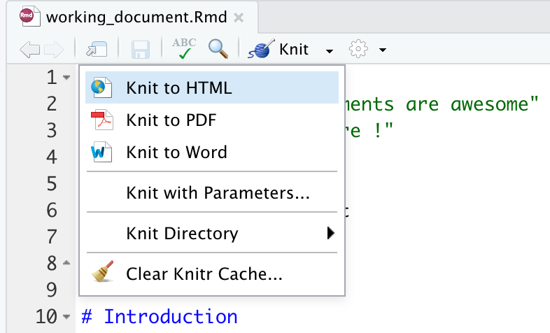 Knitting to 3 Different Formats We can Knit working_document.Rmd into HTML, PDF, and Word documents, either using Control+Shift+K to Knit the whole Rmd (RMarkdown) document, or the Knit button which has the following options: