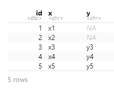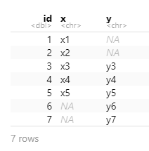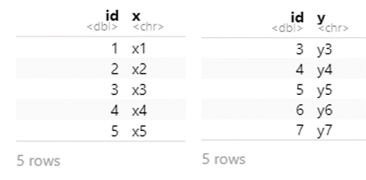 For demonstration purposes, the code below creates two tibbles (tidyverse data frames), x and y with a column in common, id , which we can imagine is patient id. Let’s also imagine that the two tibbles created here contain different information about a group of patients: x might be about outpatient appointments and y about treatments. You will see that we have intentionally included some patients in both tibbles but there are some only in tibble x and some only in tibble y. We now want to combine these tibbles for analysis.