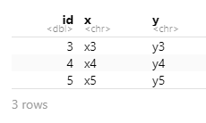 # create a new tibble called yy <-tibble(id =c(3, 4, 5, 6, 7),y =c("y3", "y4", "y5", "y6", "y7"))y