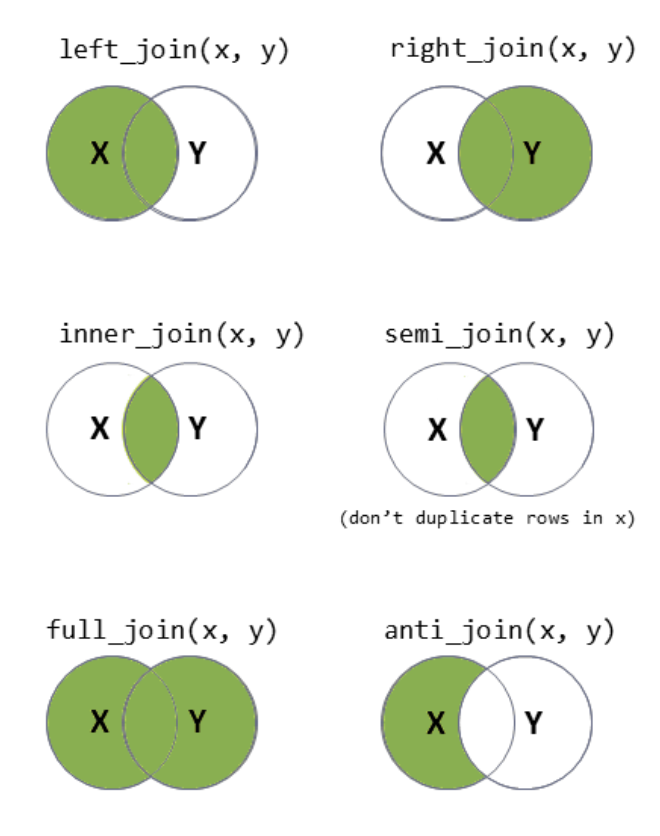 Which join you choose depends on which rows you want to keep and from which datasets. In the joins we’ll be discussing below, all columns from both datasets are kept.