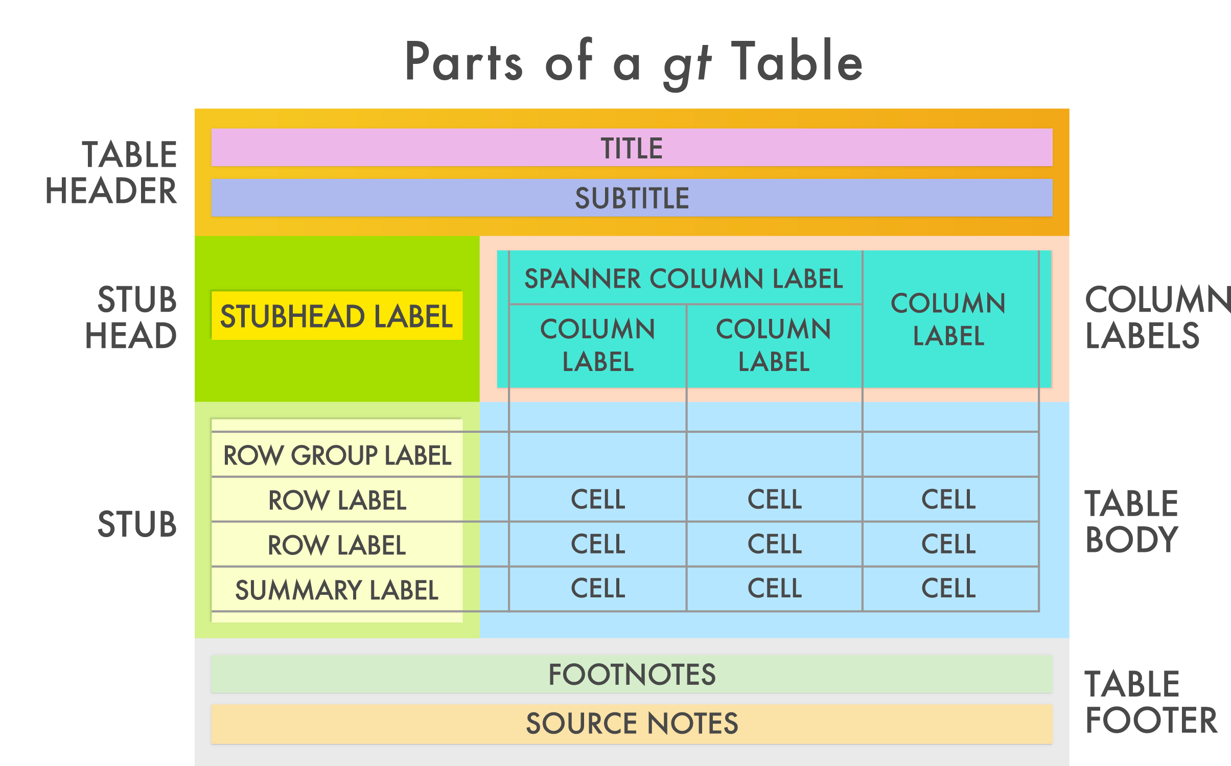 Just as we build our plots in ggplot2 with layers, we can build gt tables by editing each part or layer of the table. As the gt developers outline: “The gt philosophy: we can construct a wide variety of useful tables with a cohesive set of table parts. These include the table header, the stub, the column labels and spanner column labels, the table body, and the table footer.”