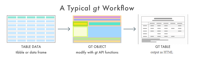 You begin with a preprocessed tabular data, such as a tibble. Next you create your gt table and customize it to your needs. Finally, the table is rendered by printing it at the console, including it in an R Markdown document, or exporting to a file using the gtsave() function.