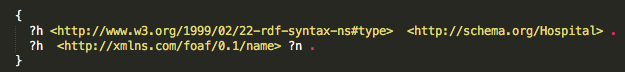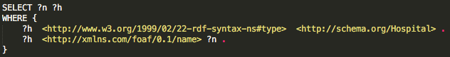 Note that by using the same variable ?h in both triple patterns in the above graph pattern, we are asking for the same h-thing to be a hospital and to have name ?n.