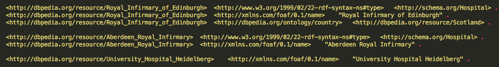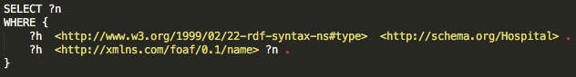 Now suppose that we are interested in the names and URIs of all hospitals in our dataset. The SPARQL query for this is as follows: