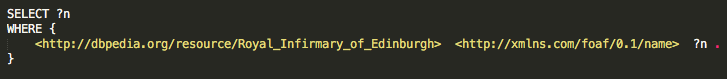 And how can we get the results for the n-variable? By specifying the SELECT-part of our query to include the n-variable. So a SPARQL query that gives us the name of <http://dbpedia.org/resource/Royal_Infirmary_of_Edinburgh> should look like this: