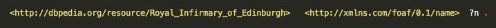 In this triple pattern, <http://dbpedia.org/resource/Royal_Infirmary_of_Edinburgh> is the subject, <http://xmlns.com/foaf/0.1/name> is the predicate and ?n is the object. The ? symbol in front of “n” signifies that this is a variable.