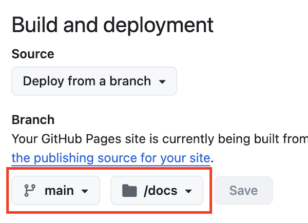 Build and deploymentsection, select themainbranch and thedocsfolder. Click onsave. GitHub will generate a URL and display it at the top of the page. This is the address of your Github page! It may take a minute or so to appear, so wait a little bit and then try refreshing the page. Your website address will be similar tohttps://edinkasia.github.io/B123456/where your Github username is the first part and the repo name is the last part.